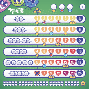 Miams est un jeu à cocher dans lequel vous devrez atteindre 50 points avant vos adversaires, grâce à vos jets de dés, que vous combinerez agilement avec vos cartes pouvoirs !